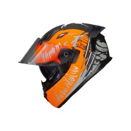 Casco cerrado para motociclista, doble visera con protector solar retráctil, preparado para auriculares bluetooth, doble certificación, forro extraíble y spoiler incluido.